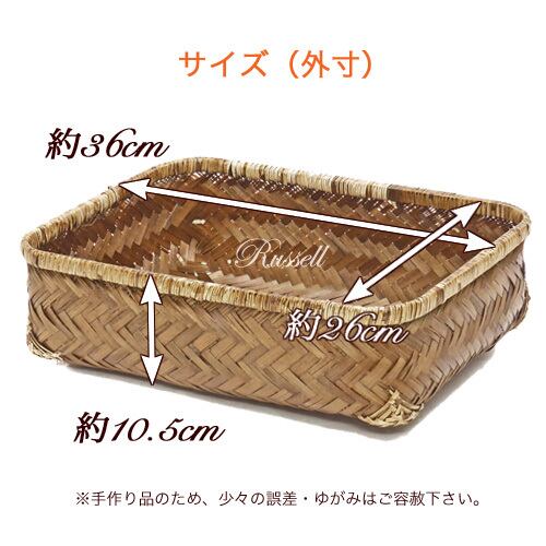 竹製かごバスケット。 小物の整理整頓に最適。 角型で無駄のないスペースとしてお使いいただけます。お部屋使い、玄関先、屋外の整理整頓までOK。 小物という小物はインテリアとしてもお洒落なこんなバスケットでお片づけしましょう。 A4サイズがゆったりと収まるサイズなので書類入れにも使え、さらに店舗の小物販売用什器や趣味の一閑張りの材料としても 人気です。