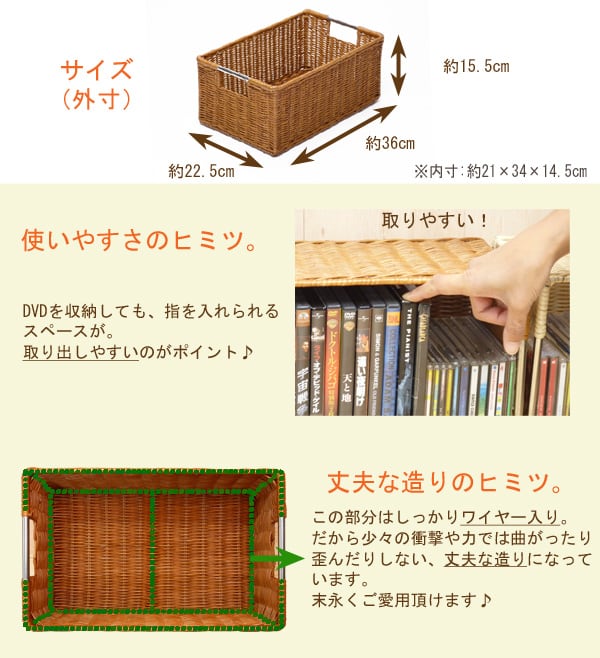 DVDやCDもすっきり収納できます。ハンドルはサビに強いステンレスを採用。