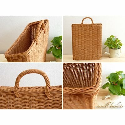 しっかりと編まれた籐のバスケット、A4サイズのノートや書類が入る便利なサイズです。壁に掛けてもご利用になれます(^-^) その場合はしっかりしたフックをご使用下さいね。 物を取り出しやすいように斜めにカットされたデザインです。自然素材の優しい風合い・ハンドメイドの温かみのある商品です。