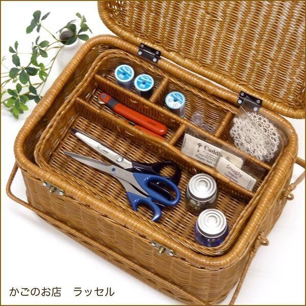 上段は細かく区切ったトレーで、裁ちバサミ・糸・ボタン・ペンなどを