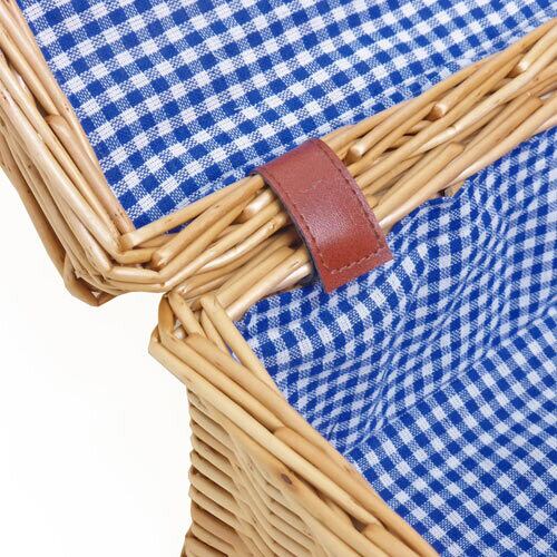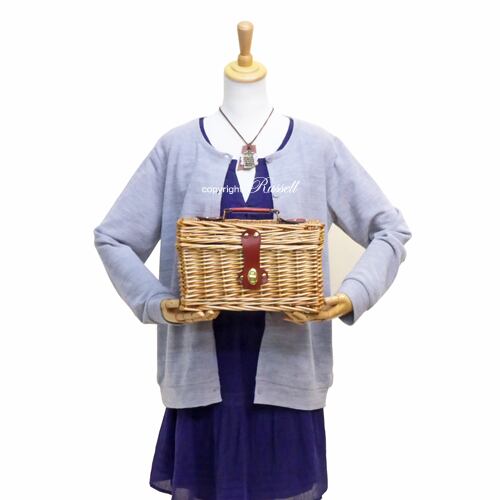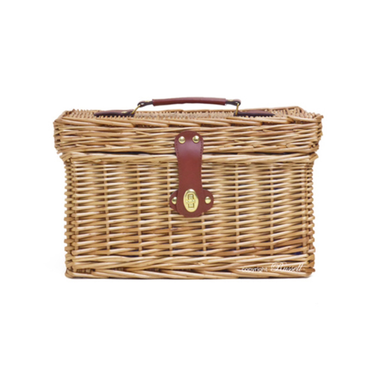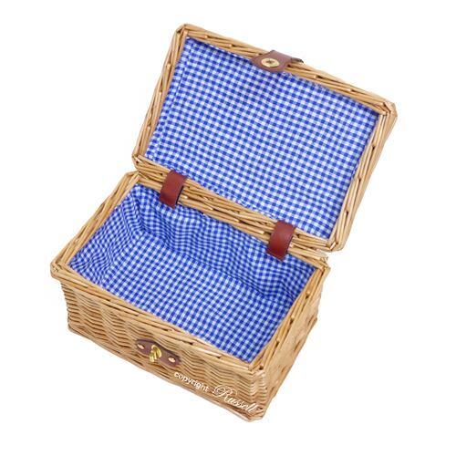 柳で編んだ ふた付きのトランク型 ピクニックバスケット。