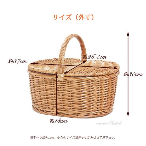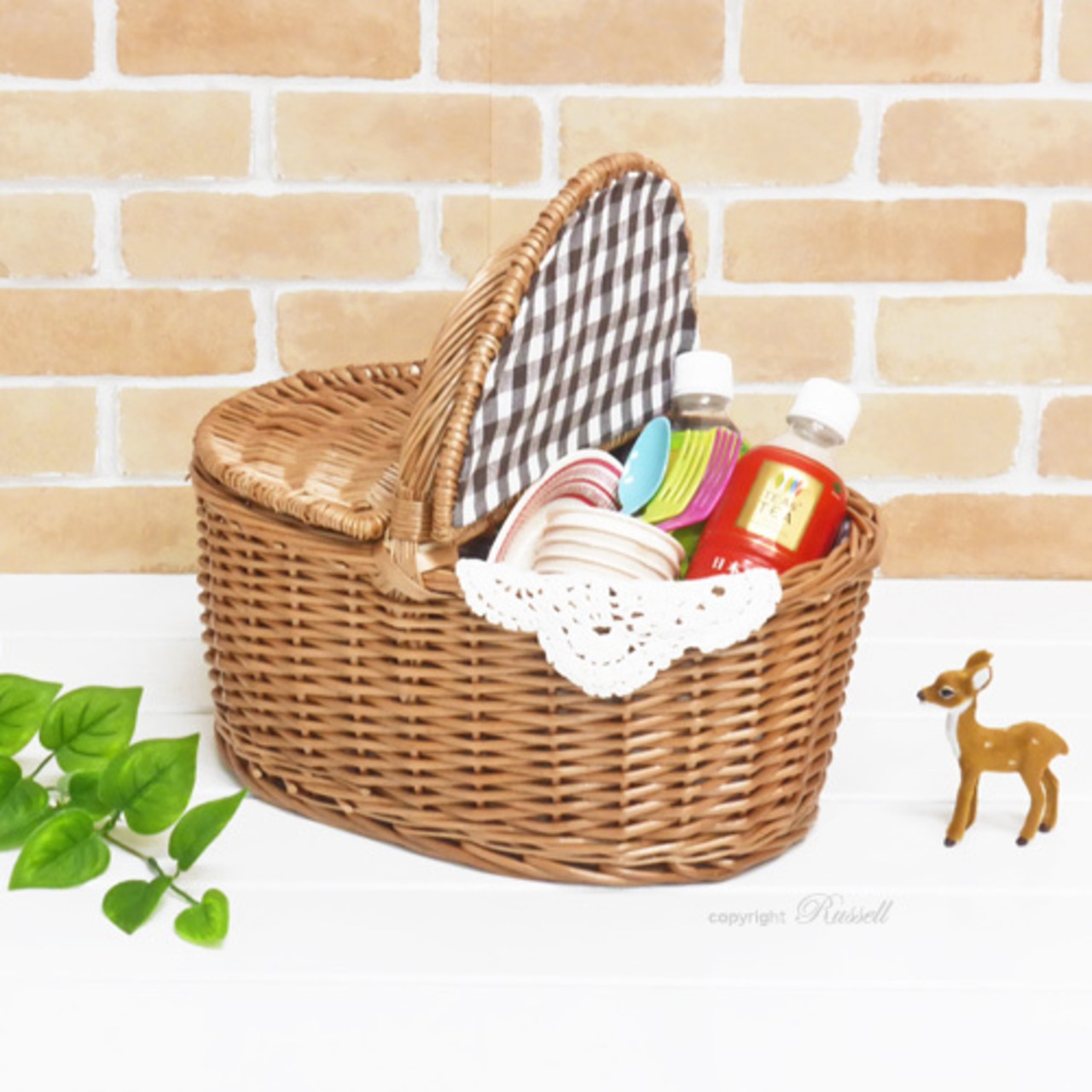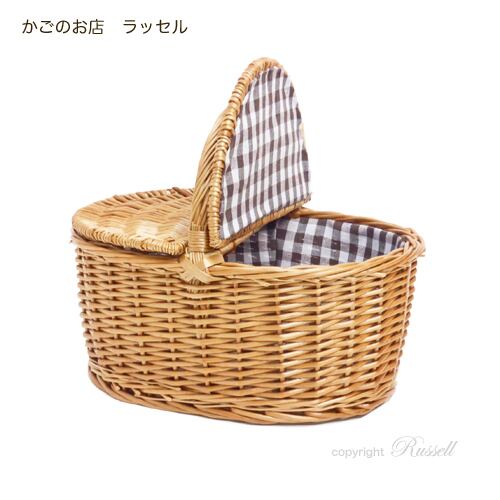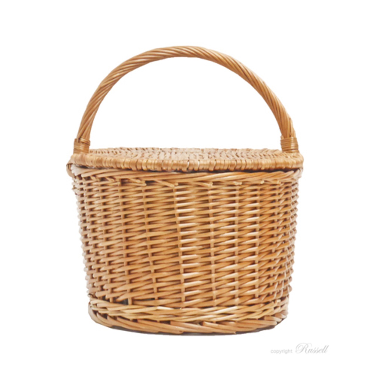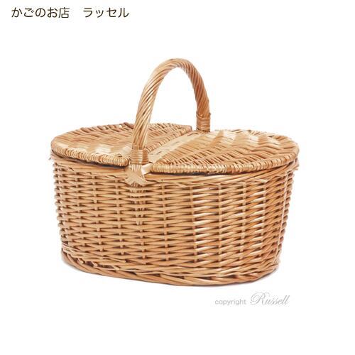 柳で編んだ ふた付き、内布付き の ワンハンドル ピクニックバスケット。
