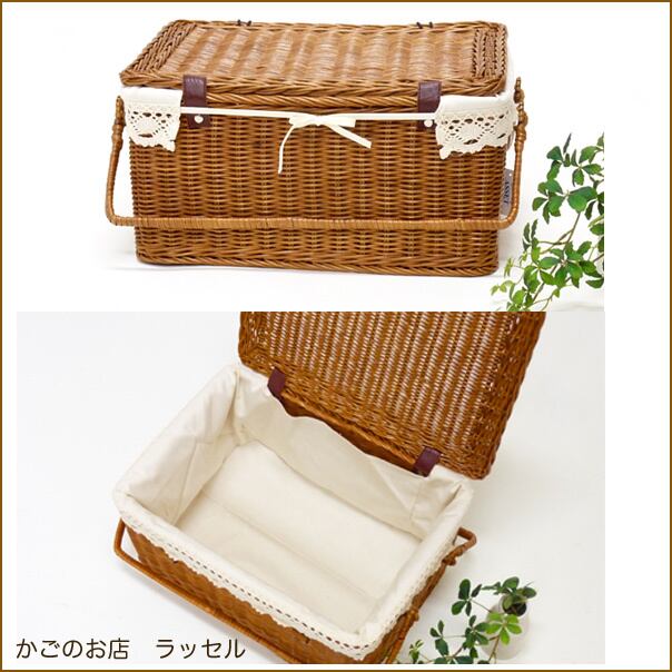 14-WF569-NA ハンドルが倒せる籐のふた付きピクニックバスケット布付(L) かごのお店ラッセル